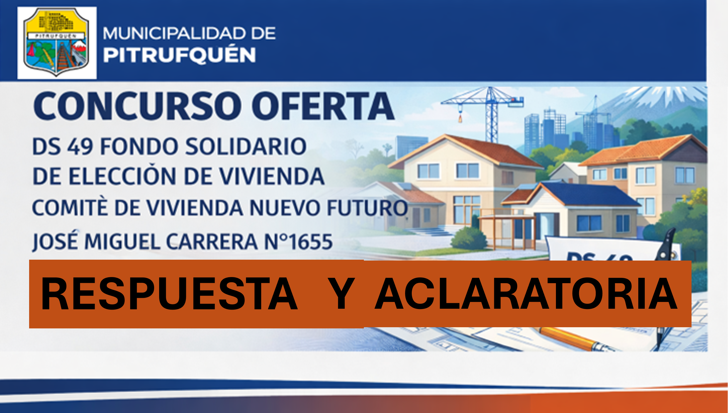 RESPUESTA “DISEÑO Y CONSTRUCCIÓN PROYECTO CONJUNTO HABITACIONAL, TIPOLOGIA CONSTRUCCIÓN NUEVOS TERRENOS, NORMADO POR DS 49 FONDO SOLIDARIO DE ELECCIÓN DE VIVIENDA, MUNICIPALIDAD DE PITRUFQUEN - COMITÉ DE VIVIENDA NUEVO FUTURO, CALLE JOSÉ MIGUEL CARRERA N°1655 PITRUFQUEN”.